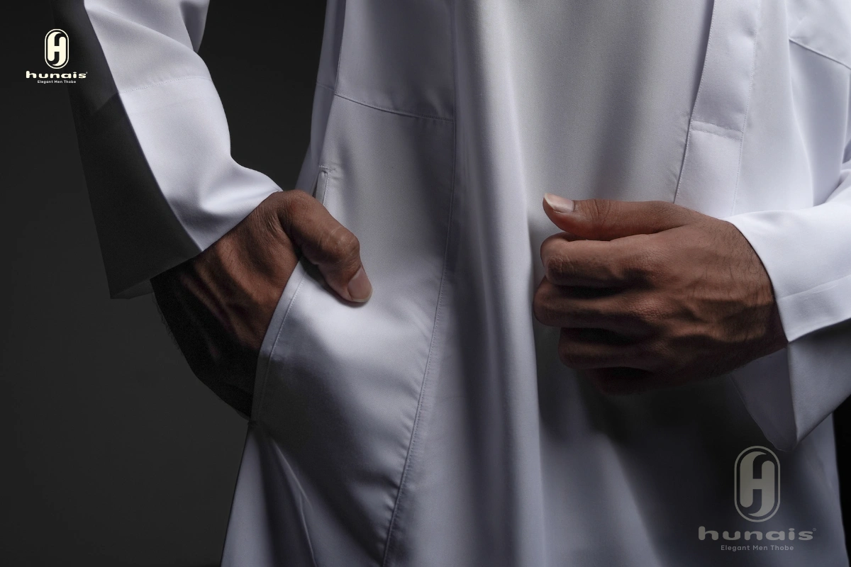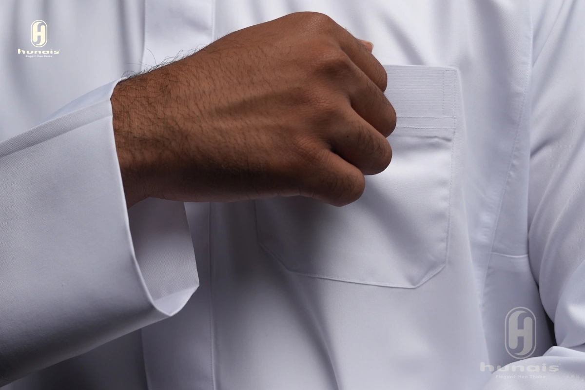 Jubah ini memiliki dua saku samping dan satu saku dada, fungsional untuk menyimpan dompet, kunci, atau tasbih kecil.